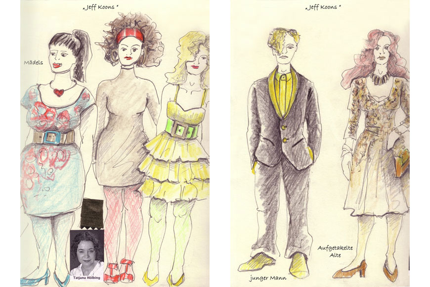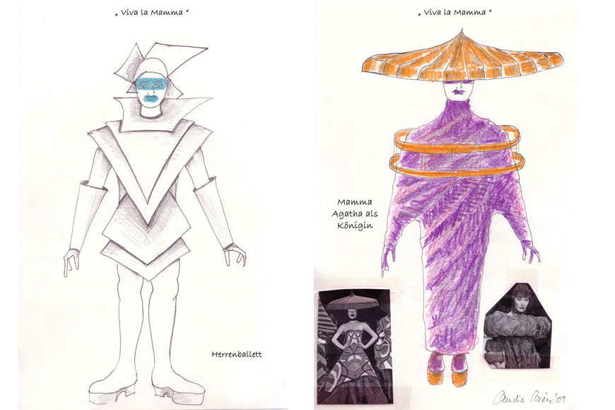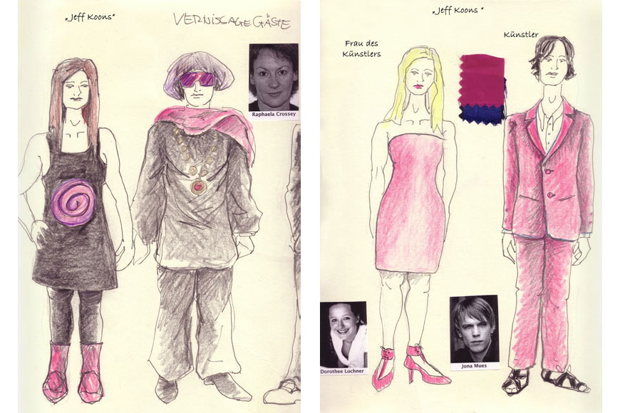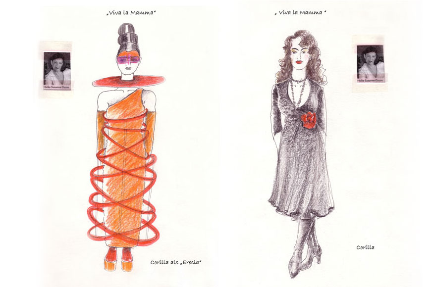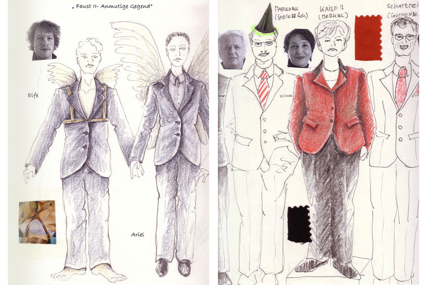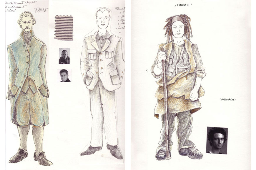 Wenn ich Zeichnungen erstelle, geht es mir in erster Linie darum die Form, Linie und Farbwahl des Kostüms darzustellen. Regie, Darsteller und Werkstätten sollen gleichsam schnell erkennen können, worum es mir bei einem Kostüm geht. Um das zu erreichen, verwende ich neben den Zeichnungen auch gerne Kopien oder Fotos, um die Konzeptidee dadurch noch besser zu verdeutlichen.